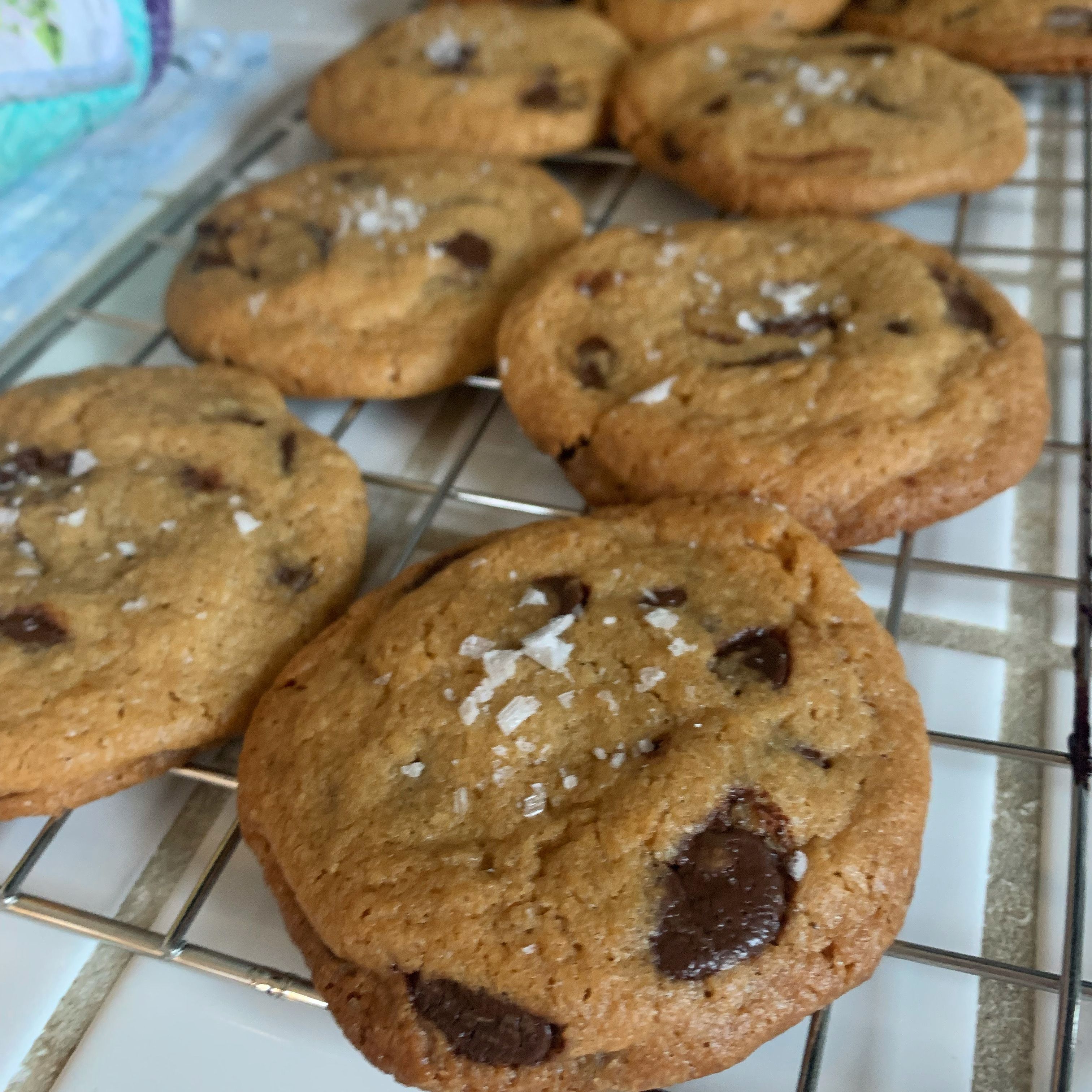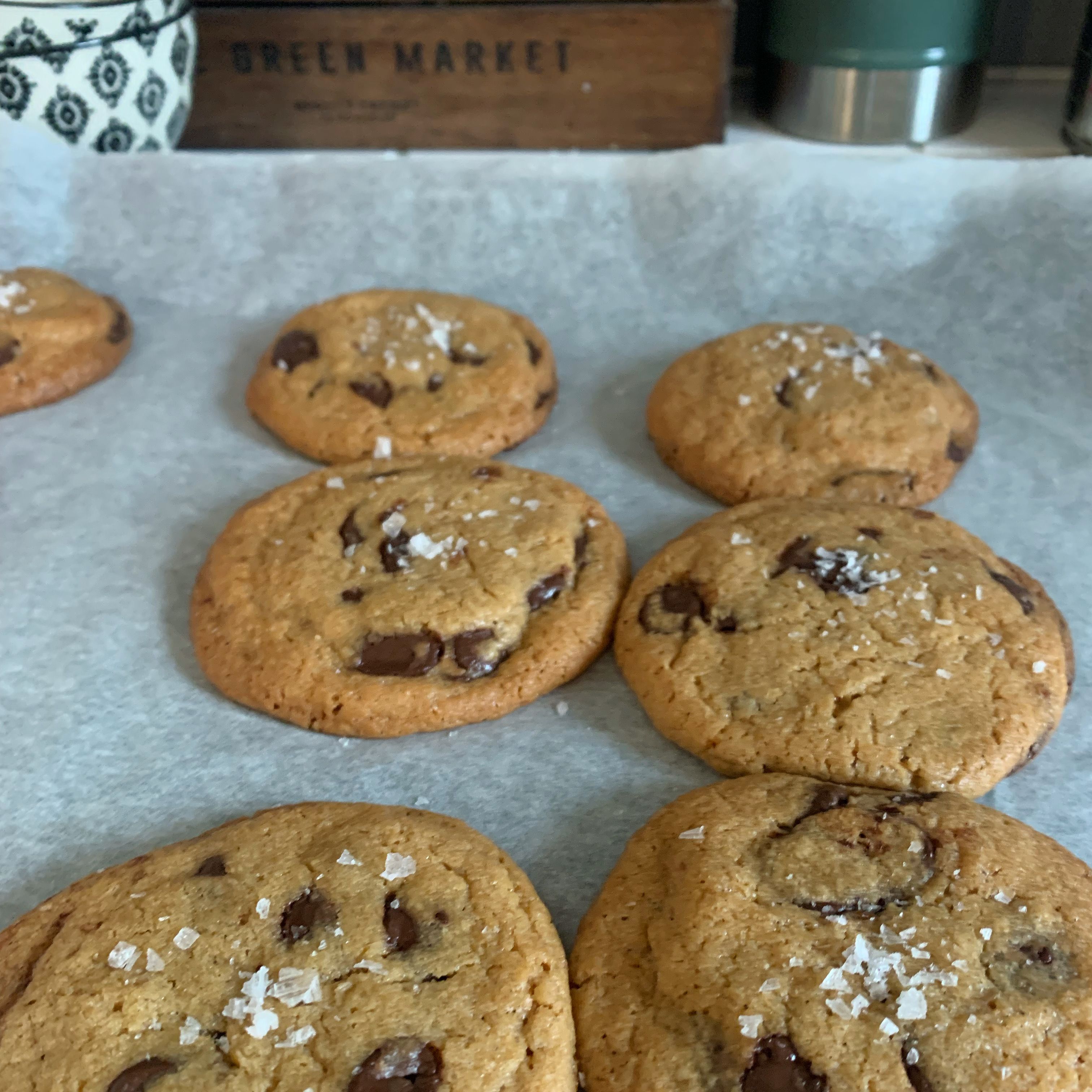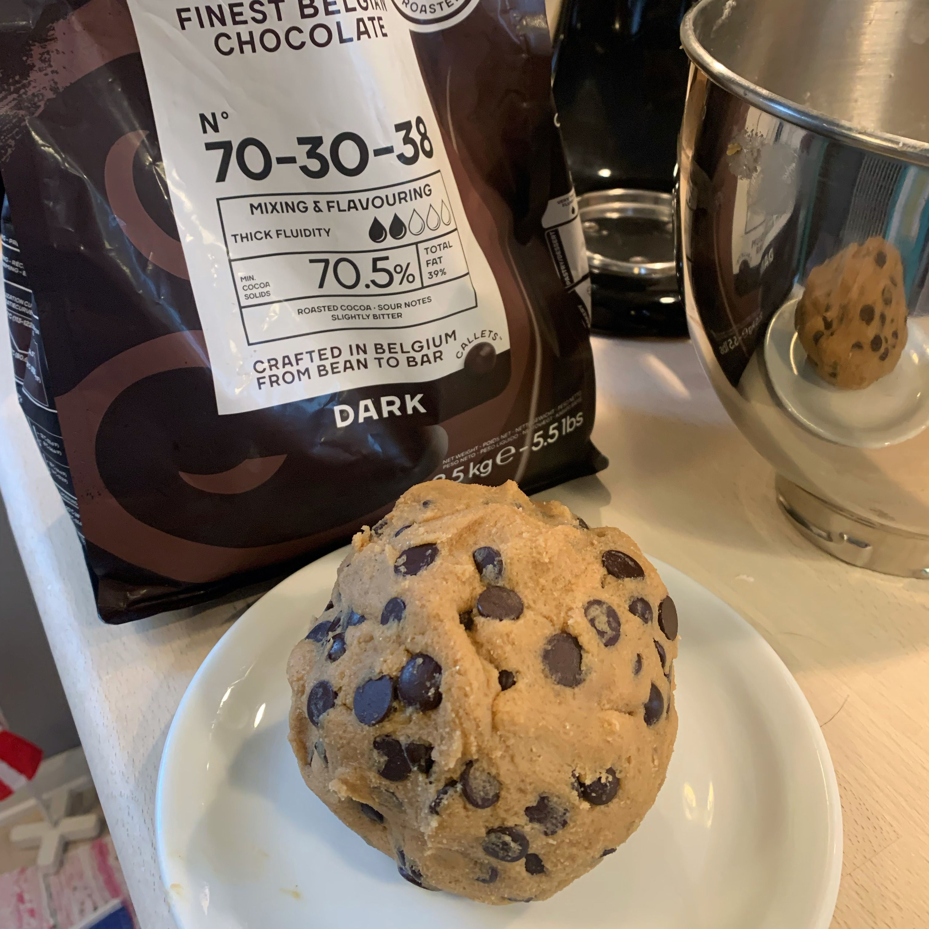 Sæt herligheden på køl, gerne 1-2 timer før du Triller 18 kugler af 50 gr. stykket. Bag af 2 omgange 9 kugler på hver bageplade ved 175 grader i ca. 15-17 minutter. Til Cookies er Gyldne, sprøde i kant og CHEWY i midten.